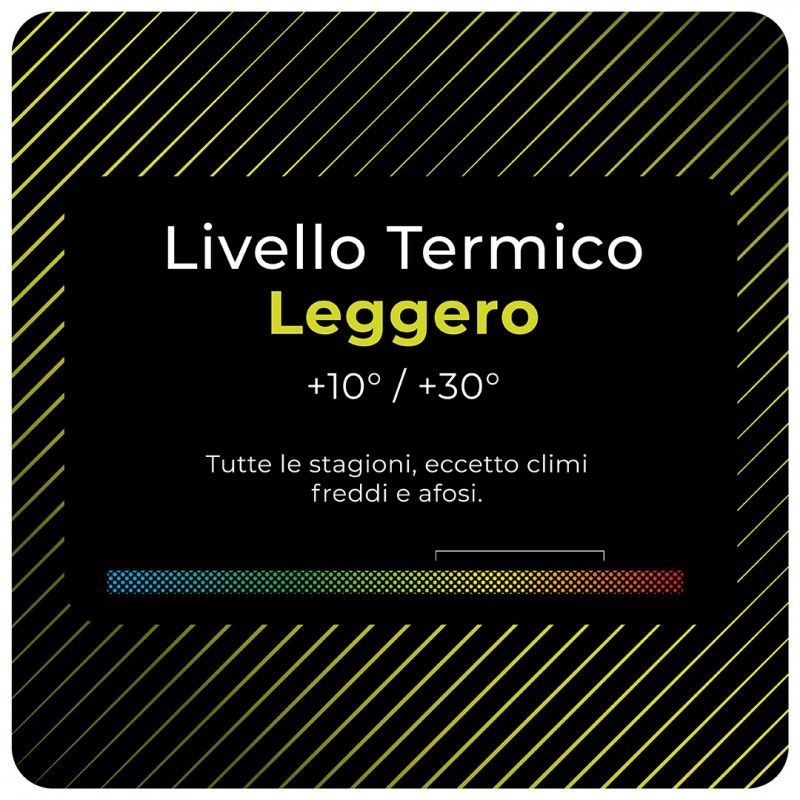Livello termico leggero (10°/+30°) - Ideale per tutte le stagioni, eccetto clima gelido e afoso. È utile tener conto della percezione soggettiva e dell’attività fisica prevista. Le temperature presenti nei nostri livelli termici sono puramente indicative.