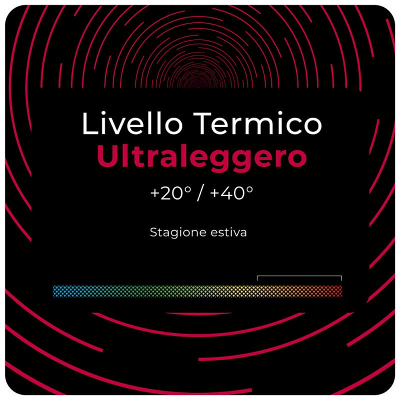 Livello termico ultra leggero (+20°/+40°) - ideale per la stagione estiva e le giornate calde di mezza stagione. È utile tener conto della percezione soggettiva e dell’attività fisica prevista. Le temperature presenti nei nostri livelli termici sono puramente indicative.
